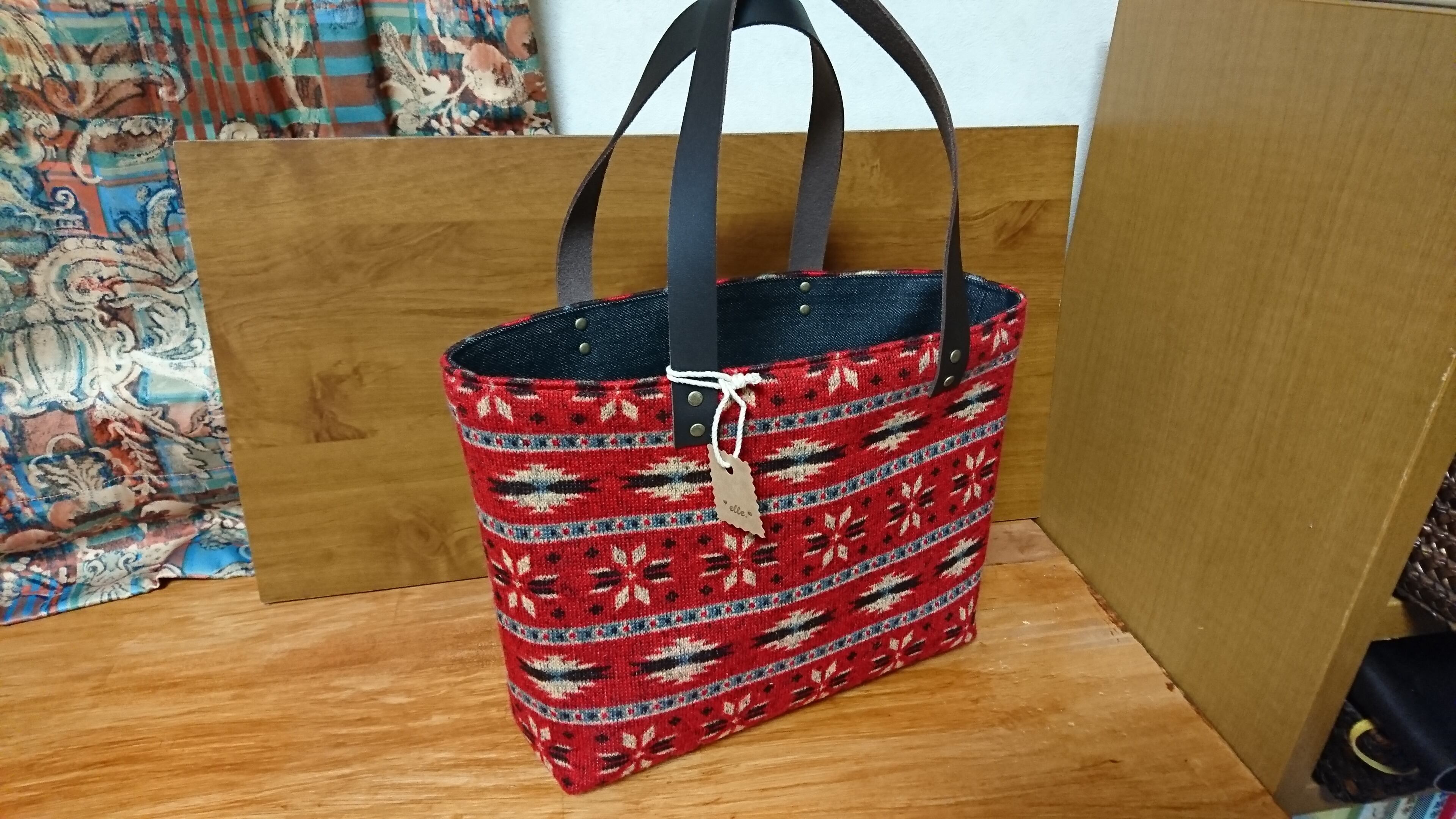 持ち手が革のニット素材のトートバッグ〈レッド〉バージョンです♪